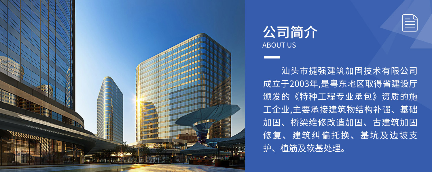 • 汕頭市捷強建筑加固技術(shù)有限公司是粵東地區(qū)取得省建設(shè)廳頒發(fā)的《特種工程專業(yè)承包》資質(zhì)的施工企業(yè)。
